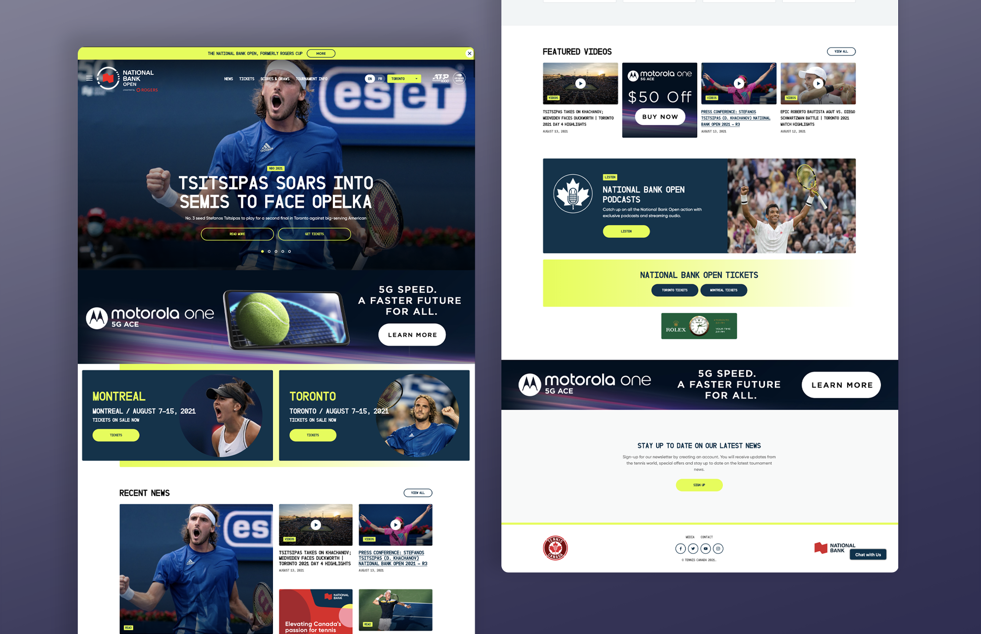 Motorola had a product launch and a high visibility partner placement to fill. I designed a suite of display ads for the National Bank Open tennis tournament site promoting the Motorola One 5G Ace, adapting the creative across multiple sizes while keeping the brand sharp throughout.