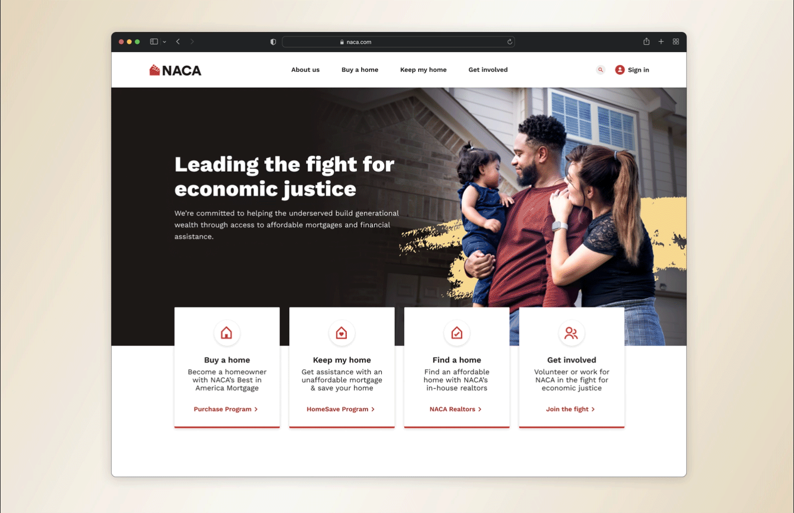 NACA needed a website that felt as purposeful as their mission. Working collaboratively with another designer, I led concepting and wireframing and took the homepage and several pages through to final UI. The result was a modern overhaul that honored the organization’s commitment to affordable homeownership and social justice, alongside a refreshed logo.