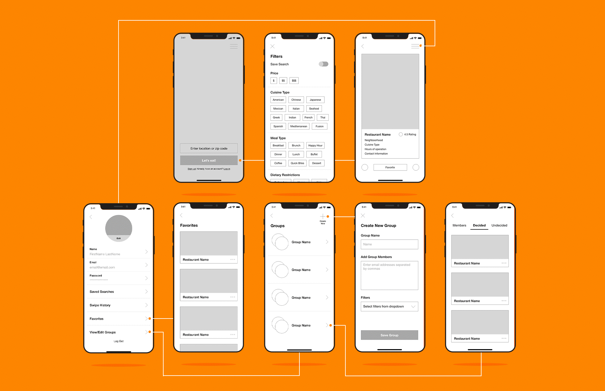 I had an idea and ran with it. I validated the concept through UX research, then built out the full design system, style guide, and responsive UI, creating a location-based restaurant app where groups swipe on nearby options and land on a shortlist everyone can agree on.